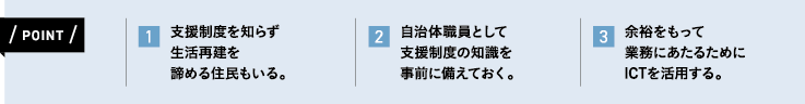 “見えない未来”に備える意識と、職員の業務を支える仕組み。この両輪が、災害後の生活再建支援を大きく前進させるカギになりそうだ。