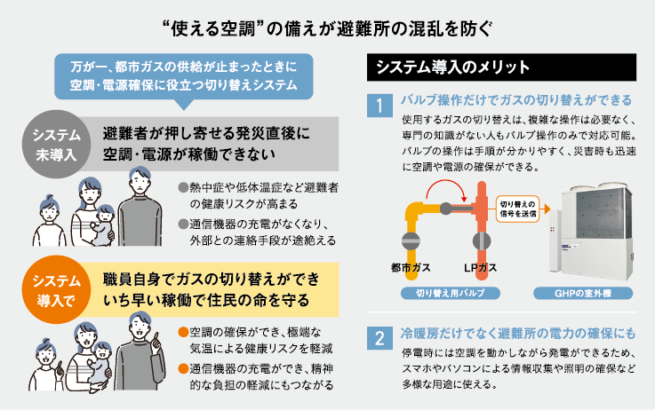 「近年は自然災害も多発しており、災害時は電気やガスが供給停止する可能性が考えられます。そのため、広域の中学校区を対象とする避難所には、LPガス貯槽タンクを設置し、“LPガス・都市ガス切り替え機能”と、発電ができる“電源自立機能”により、空調を一定期間稼働できるGHPを採用しました」。同製品は、平時は都市ガスを利用してコストを抑えながら運転し、災害時に都市ガスが止まった場合には、燃料をLPガスに切り替えて運転を継続できる。さらに、停電時には、空調を稼働させるだけではなく、照明やコンセントなどの電源としても活用が可能になる。