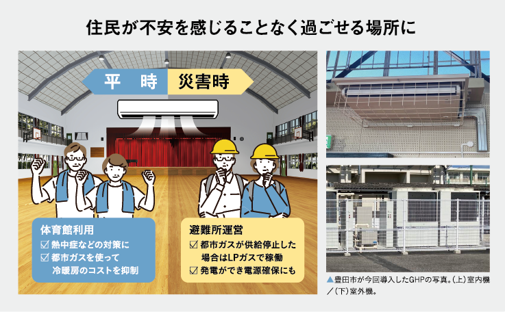 猛暑日の増加などにより、豊田市では小・中学校の体育館に冷暖房設備の設置を検討。防災面も考慮し、市内16校に都市ガスとLPガスの切り替え機能と発電機能を備えたガスヒートポンプエアコン(以下、GHP)を導入した。