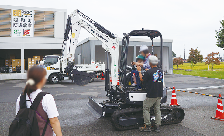 ▲防災訓練で、災害対応車両(ショベルカー)に試乗している様子。