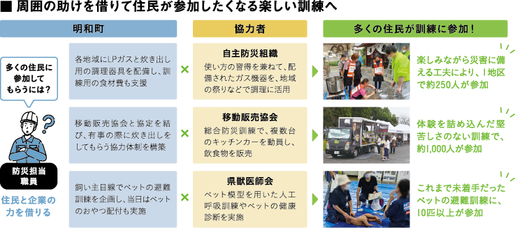 明和町では、水害に備えて企業の施設を避難場所として借りたり、物資提供を受けたりする協定を締結。防災訓練では住民目線で“参加したい”と思える内容を企画し、企業と住民の防災意識が向上するように促している。