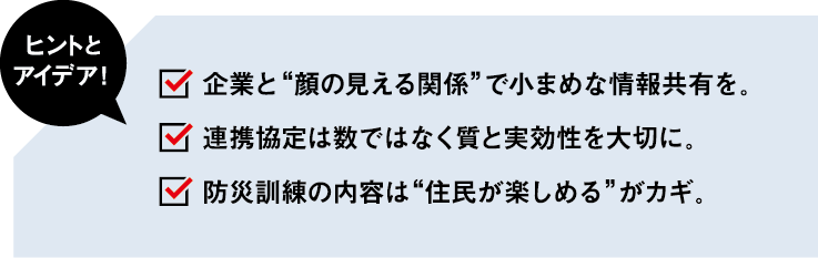 企業に支援を求めながら防災体制を整える同町。最近は企業からの声かけも増えているそうだが、決して連携数の多さにこだわっているわけではない。あくまで意味のある連携に重きを置いているそうだ。「数が増えるほど、やりとりを行う企業が増え、協定式の準備も必要になります。担当職員の負担が大きくなるため、協定の実効性を慎重に見極めています」と、吉永さん。