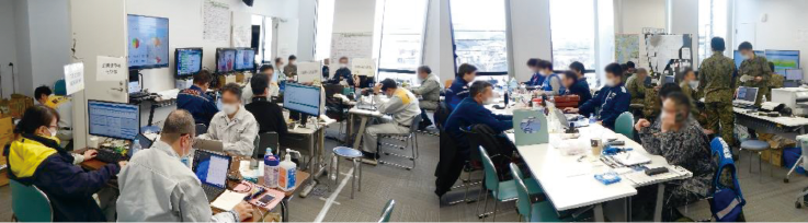 ▲オペレーションルームの様子。輪島市職員と、総括支援、自衛隊や省庁職員、DMATなどがワンチームで対応。