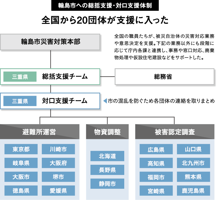 ※平成30年に創設された、被災自治体へ他自治体の職員を派遣する制度。首長の災害マネジメントを支援する“ 総括支援”と、各種災害対応の実務やノウハウ提供などを行う“対口支援”がある。