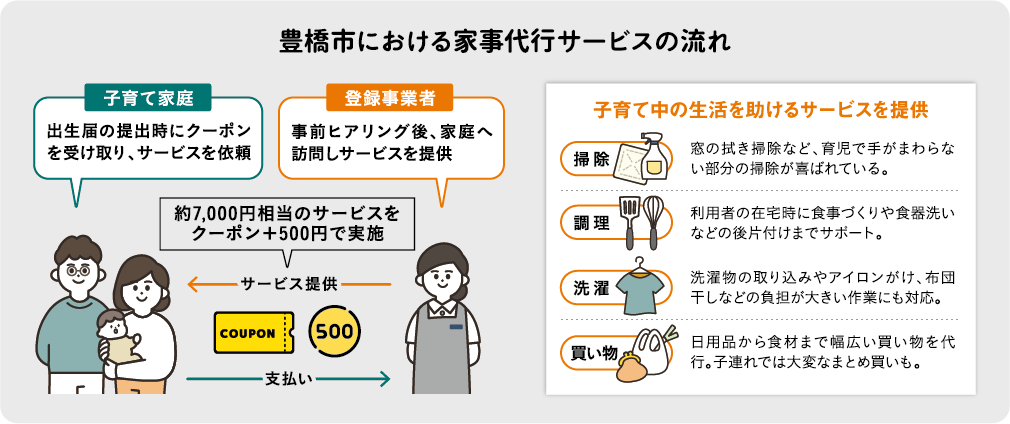 子育てしやすい環境づくりを進める豊橋市。家事代行サービスに使える独自のクーポンを、出生届の提出時に直接渡している。1回につき500円で最大6回まで利用できる支援制度を整備し、0歳児がいる家庭の負担軽減を図る。