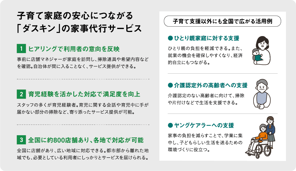まず取り組んだのが事業者探しだ。実績に加え、サービス中のトラブルなどに緊急対応できる体制が整っていることも選定のポイントとした。条件を満たした3社のうちの1社が「ダスキン」だった。同社は掃除や調理などの家事代行サービス「メリーメイド」を全国で展開。利用者への事前ヒアリングを徹底するなど、安心して利用できるよう配慮された仕組みを整備している。「人手が足りず対応できないという事業者もありました。そうした中、知名度の高い同社が参画してくれたのは、とても心強かったですね」と小久保さんは話す。
