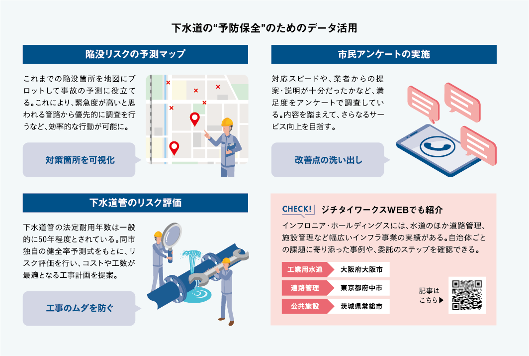 さらに太田さんは「職員が保全戦略の検討に集中できるようになりました」と明かす。「同社は日々の業務から得た様々なデータを蓄積しています。下水道管の耐用経過年数に対する評価や、将来的な陥没リスク分析などをもとにした提案のおかげで、より具体的な計画策定が可能になりました」。