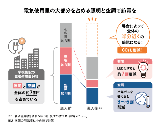 照明と空調の両軸で節電を進めることで、場合によっては全体の半分近い電気使用量削減が見込めます。これまでとは違う視点で、効率的に光熱費を抑えることができれば、必要な設備改修や新たな取り組みに費用がまわせるようになります。照明と空調は、住民や職員が快適に過ごす上で欠かせないもの。使用を控えるのではなく年間を通して快適に稼働させながら節電できることは、大きなメリットといえます。