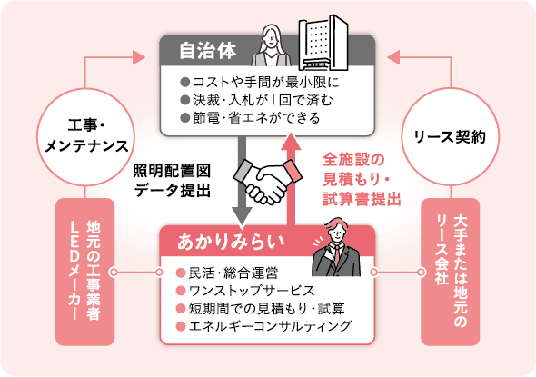 優先的に進めてほしいのは、照明のLED化です。従来の蛍光管は2027年末までに製造禁止となることが決まっています。世界的に見てもレアメタルを原料とするLED資材は手に入りにくくなっており、需要がひっ迫して価格が高騰する前に着手する必要があります。そこで当社では、リースを活用し、一括で全公共施設の照明をLED化することを提案しています。施設数が多くても、民活なら費用は公共工事の数分の一で、資材の確保や工事もスピーディに。また、初期費用がかからず予算確保も不要です。約7割の節電効果で削減できた電気代をリース費用に充てても余剰が生まれます。さらに、10年間の契約期間中はメーカー保証で修繕費は不要。期間満了後は照明が無償で譲渡されます。工事は天井を削らずに済む“管交換方式”で行えば、アスベスト規制にもかかりません。