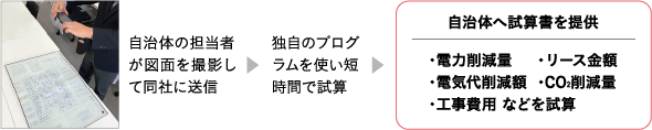 対象施設の照明配置図をスマホで撮影して送ってください。当社の“AI図形認証システム”が照明の種類を識別して灯数を割り出し、早ければ数日のうちに試算書の提出まで完了します。電力削減量、リース金額、電気代削減額、CO2削減量などが試算できるので、具体的な数字をもとに検討して議会提案しやすくなるはずです。補正予算が通ればプロポーザル入札を経てリース契約を結び、資材発注します。通常は時間と手間がかかる準備が短くなるため、年度内の実施も進めやすくなりそうです。