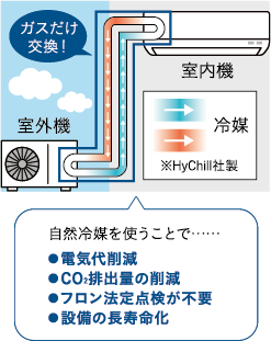 空調などの熱を運ぶ“冷媒”には、従来フロンガスが使われてきた。炭化水素系の自然冷媒に替えることで、環境負荷を軽減し、電気代を削減する。
