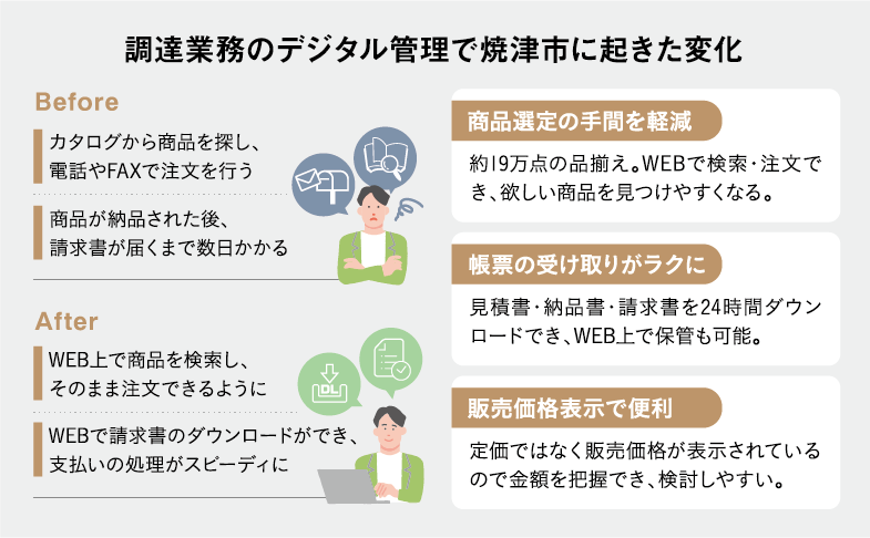 消耗品などの調達に時間を割きたくはないが、商品探しに時間がかかることもある。そこで焼津市では、地方公共団体向け商品が揃い、金額も分かりやすい調達サービスを利用。請求処理もスピーディになったという。