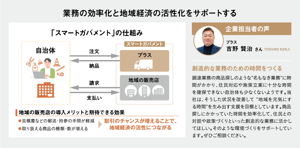 そんなときに紹介されたのが、「プラス」が運営する調達サービスだった。流通事業を展開する同社では、企業や学校、介護施設の調達業務をサポートしてきたノウハウを活かし、地方公共団体に特化した「スマートガバメント」を提供している。WEB上で商品を検索・注文できるだけでなく、地域の販売店を支払先に設定するという地方公共団体にとって利便性の高い仕組みだ。「商品名や型番で検索できるので、探す時間が圧倒的に短縮されました。また、当市は環境に配慮した商品を優先して購入しています。同サービスでは、該当商品に“グリーン購入”と表示され、一目で分かるので使い勝手もいいです」と櫻井さんも喜ぶ。