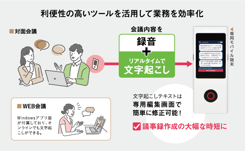 同ツールは、マイクが内蔵された専用モバイル端末のボタンを押すだけで、録音と文字起こしが開始されるもの。音声とテキストはクラウド上に即時アップロードされ、WEBブラウザ上の専用編集画面から、聞き直しや修正が行える。さらに、編集画面には生成AI機能が搭載されており、議事録の要約や箇条書きでの表示といった文章加工がワンクリックで容易にできる。また、携帯電話回線を利用するため、外出先やLAN環境のない場所でも使用でき、活用の幅が広いという。