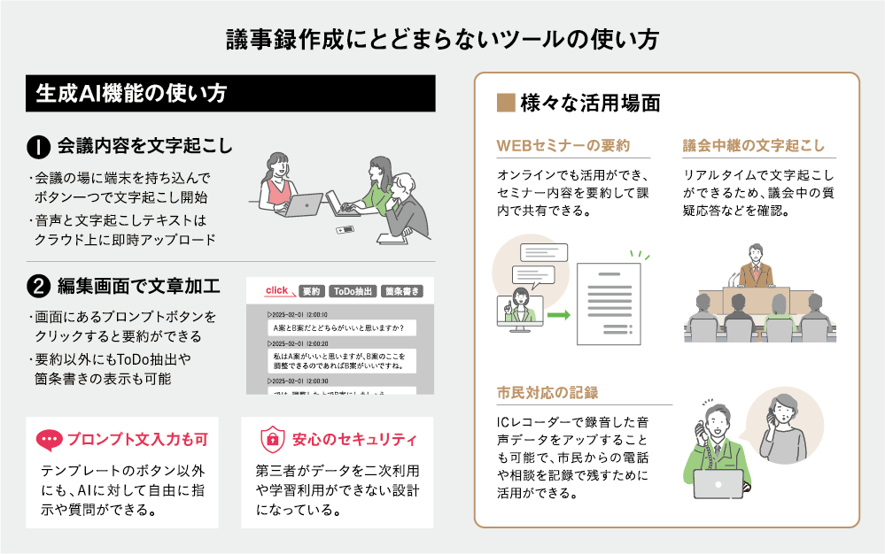 ボタン一つで操作できる点が好評で、業者との協議の記録、報告書作成など議事録作成以外にも広く活用されているそうだ。「議員と住民の意見交換の場でも、住民の声を残す手段として使われています。音声が端末に残らないのでセキュリティ面でも安心です。ここまで様々な活用場面があるとは予想以上でした」。