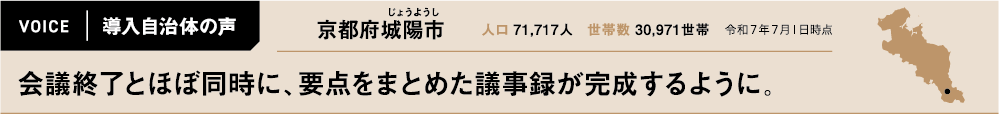 令和4年度に「DX推進計画」を策定し、デジタルを活用した業務効率化を進めていた城陽市。従来、議事録作成の業務負担を課題に感じ、ツールを導入していたが、現場は不便を感じていたのだという。「録音データをアップロードするなど、操作に手間がかかってスムーズに使えなかったのです。そこで、リアルタイムで文字起こしができるツールを探していたところ、ジチタイワークスの記事を見つけて、トライアルを開始しました」と所川さん。実際に試してみると、職員からは肯定的な声が多数寄せられたという。そして、月1万円からの利用プランでスモールスタートできる点が決め手となり、令和7年度に本導入へ至った。