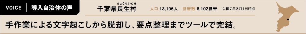 長生村では、ICレコーダーで録音した会議内容を手作業で文字起こししていた。この作業が非常に手間だったと語る小髙さん。「時間がかかるのはもちろん、イヤホンを着けて作業することで、電話対応や窓口対応がおろそかになることもありました」。そうした中、同ツールを知る機会があり、トライアルを実施。その使い勝手のよさから、令和6年の補正予算で導入を決定した。「実際に試してみて、変換精度の高さに納得したことに加え、比較的安価で利用しやすい点が決め手になりました。また、同社のサポート体制も安心できたポイントの一つです」。