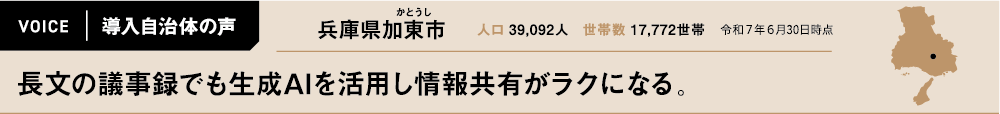 従来、議事録作成は外部委託を行っていた加東市。しかし、納品に2週間ほどかかる点がネックとなり、職員が自ら作成することもあったという。そこで、文字起こしツールを導入したものの、操作が難しく職員の間で浸透しない結果に。そうした状況を改善したいと思った林さんは、手軽に使えるツールを探していた。そんなとき、同ツールを紹介され、トライアルを実施。「試してみると当課が説明しなくても、職員がどんどん使ってくれる状況になり、これはいいと思いました。従来の課題が解消されたので、導入もスムーズに進みました」。