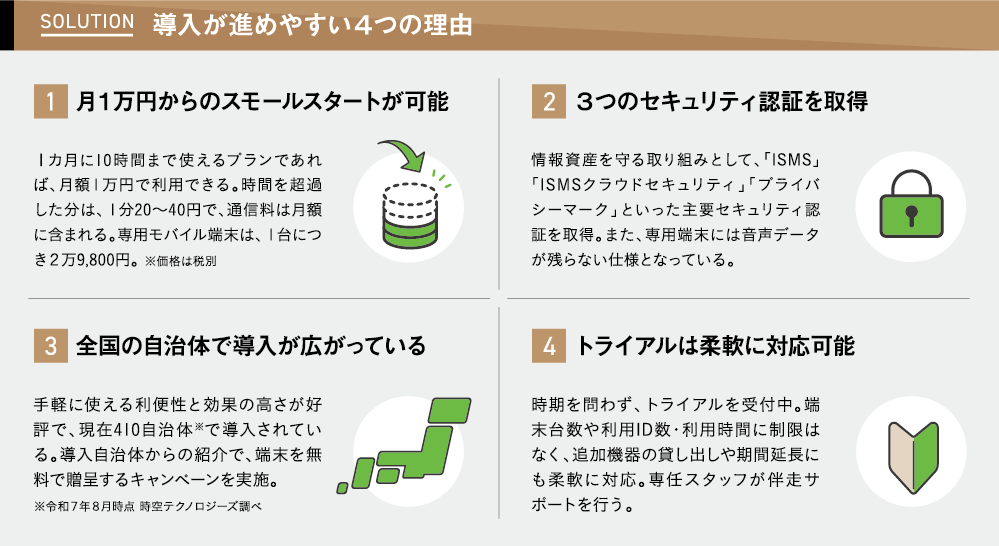 同市では専用端末を15台導入し、議会や監査部門など使用頻度の高い部署をはじめ、出先機関を含めた全庁で利用している。「クラウドサービスなので、導入時にはセキュリティ面での懸念を指摘されましたが、同社がセキュリティ認証を取得していることを説明しました。また、利用に抵抗のある部署に対しては、便利だという職員の声を共有。“自分も使ってみよう”と思ってもらえるように工夫しました」。そのほか、変換精度を高めるために会議室でのマイク配置をサポート。ツールの活用を後押ししたそうだ。