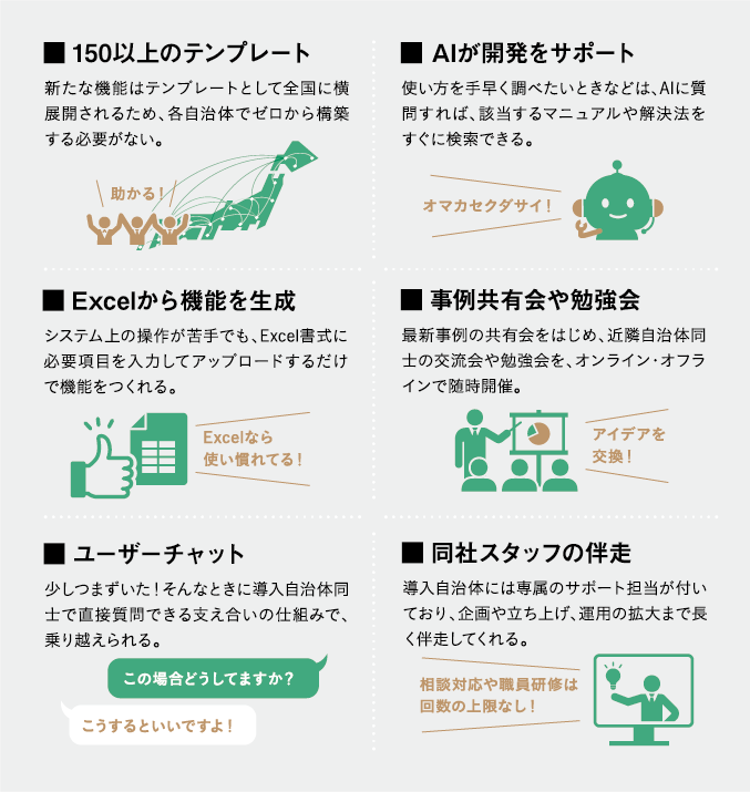 手軽なノーコードツールだが、さらに開発のハードルを下げるために様々な仕組みを用意。追加料金なしで全てのサポートが受けられる。