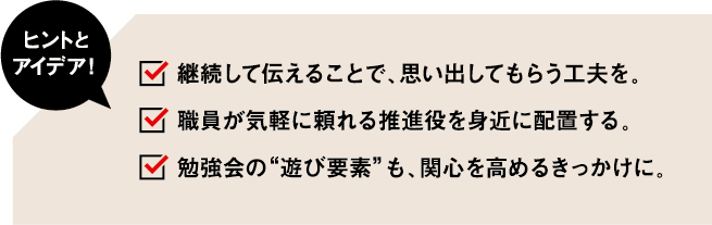 役立つ情報を小まめに発信しつづけて、推進役と一緒になって広めていく。