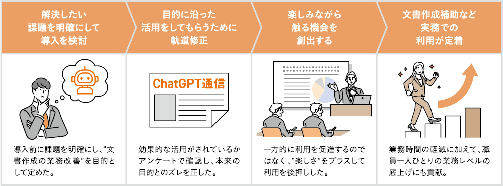 「アンケートで分かったのは、“検索に使うもの”という認識が強いことでした。当時のChatGPTは、検索精度が今ほど高くなく、誤った情報が出てくることも多々ありました。そのため“使えない”と感じている職員も少なくなかったのです。利用方法の軌道修正を図るため、“ChatGPT通信”という庁内報を毎週発行し、使い方やプロンプト※の作成について学べるようにしました」。この庁内報の効果は高く、生成される文章の質が徐々に向上。実証実験の終了時には、活用を継続したいという声が多く寄せられたそうだ。