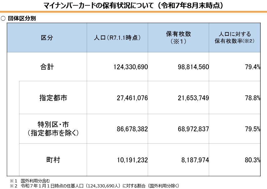 令和7年8月末時点の総務省資料によると、全国のマイナンバーカード保有枚数は98,841,560枚、人口に対する保有枚数率(普及率)は79.4%である。この普及率は、自治体におけるデジタル化推進の進度を測る重要な指標といえる。