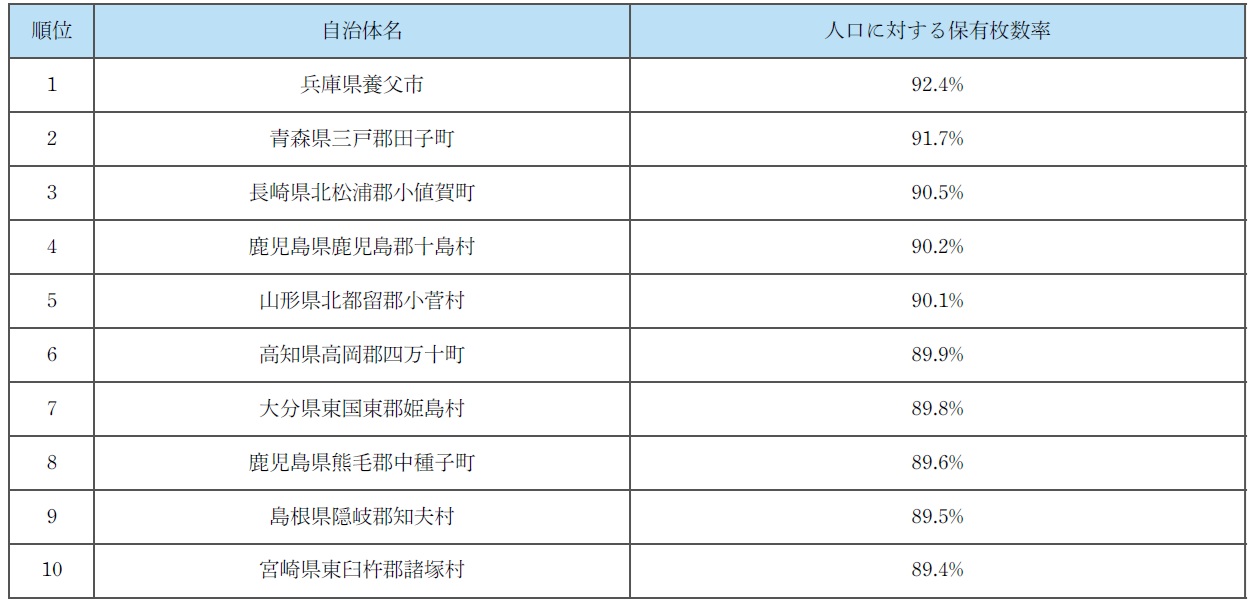 市町村別のマイナンバーカード普及率を見ると、上位自治体の多くが90%超を達成している。中でも兵庫県養父市(92.4%)、青森県田子町(91.7%)、長崎県小値賀町(90.5%)など、地方の中小自治体が多くランクインしている。これらの自治体では、公民館や商業施設での出張申請サポートや、広報活動の強化など、住民に近い体制での支援が成果につながっている。