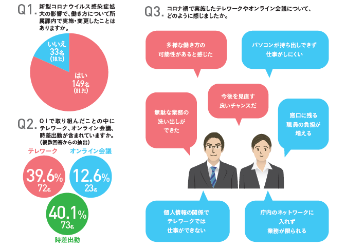 テレワークを実施した後は、数カ月に1回程度の頻度でアンケートを実施する。取り組んでみて良かった点や難しかった点など結果を分析し、今後の提案などのフリーコメントを含めて報告。職員の声を管理職層が知ることで、トップの意識を変える材料にもなる。
