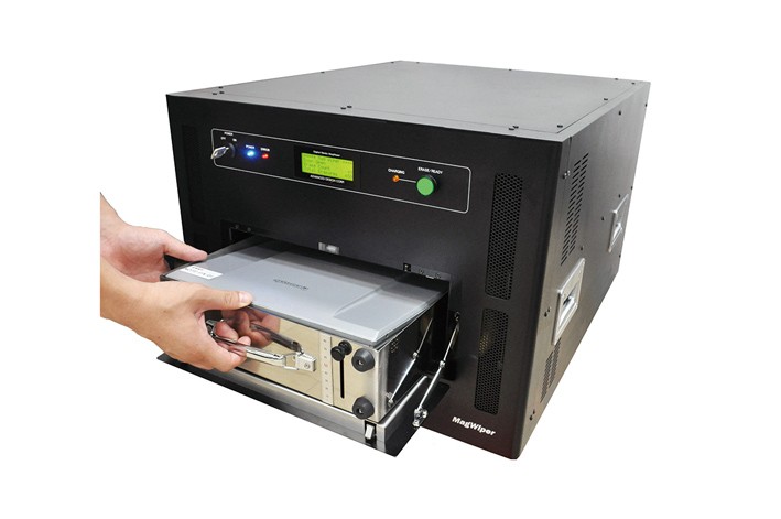 強力な磁気を当てることでHDDの磁界の向きを強制的に変え、無意味なデータに変換する(つまりデータを消去する)方法。同社の磁気データ消去機は、特許取得済みの独自技術「斜め磁化システム」を採用している。