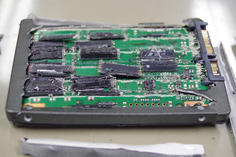 6~10トンの荷重で、メモリチップまで破壊するデータ消去法。片手の操作で十分な荷重がかけられ、ツールを交換すればHDDやSSD、LTO(磁気テープ)、各種フラッシュメモリなども破壊可能。