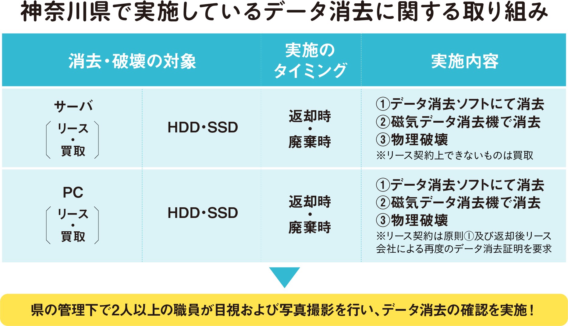 同県の情報流出防止策は、“個人情報、重要情報を含む場合”“公開情報のみの場合”それぞれの抹消措置を明確化し、さらに“抹消措置の作業完了までを県の管理下で職員が立ち合い確認すること”を基本方針に掲げ、対策を実施している。