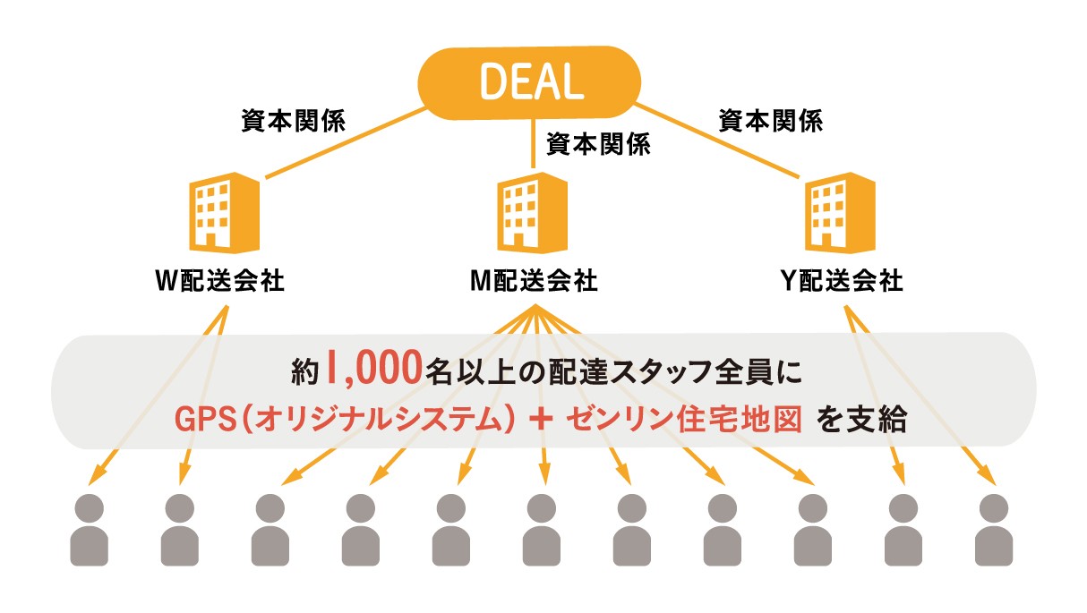 同社の強みは、営業エリアの緻密さと40年近くにわたり蓄積してきた配達ノウハウだ。もともと、全国に数十社あった地域ごとの有力ポスティング事業者が、統合・再編を繰り返しながら集約し、資本とノウハウを持ち寄ってDEALを設立した。そのため、全国に約1,000名以上の配達スタッフを擁しており、地域ごとの事情にも詳しい。