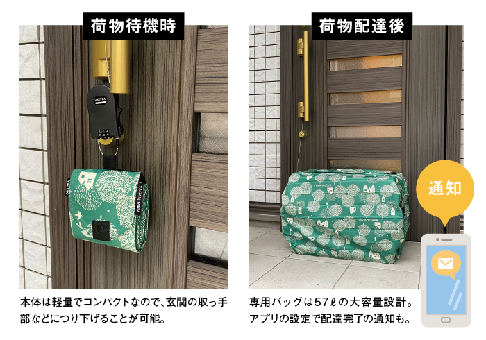つり下げ式の置き配専用バッグ(特許第6667748)。配達時には配達員がバッグを広げ荷物を収納、鍵をかけることができる。配達完了通知をスマホで受信も可。