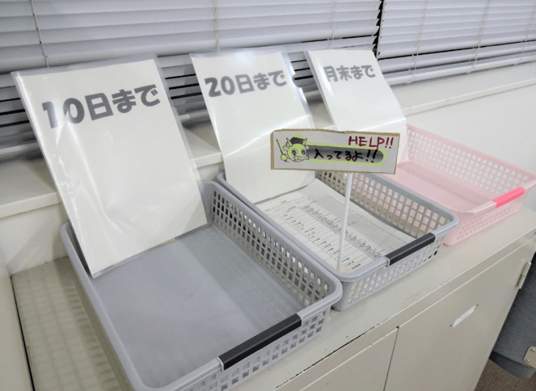 そこで「仕事をみんなで分担(シェア)する」という案が登場。「シェアボックス」と称したレタートレイと依頼票を使った「シェアボックス~ひとりで抱え込まないで~」プロジェクトがスタートしました。10日まで、20日まで、月末までの3パターンの期限に分けたシェアボックスを課内に配置し、「このままでは一人で終わりそうにない」と判断した人が依頼票に仕事内容などを書き込んでシェアボックスに入れます。仕事を早く終えた他の職員はその依頼票を確認し、代わりに処理をするのです。