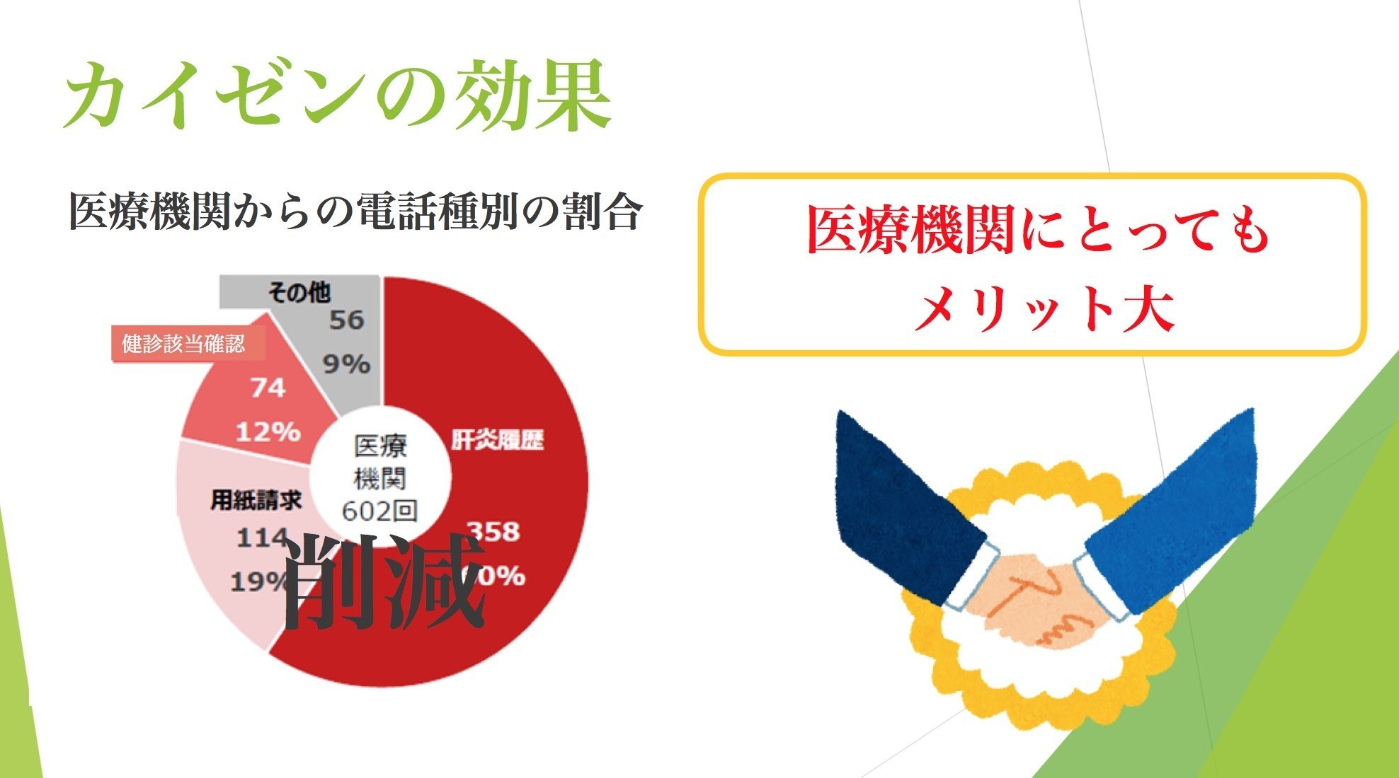 電話対応の時間を削減するため、まずは医療機関からの電話依頼をメールやFAXから受付できるように切り替えました。また、平成31(2019)年度からは市民に送付する健診受診券に、肝炎ウイルス検診の実施履歴を初めから記載。さらには、医療機関からの問い合わせ専用の電話回線を設けることで事務時間のさらなる効率化に向けて取り組んでいます。
