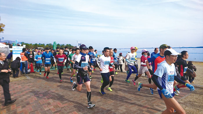 琵琶湖畔を爽快に走るランナーたち。毎年2,000~2,500人のアマチュアランナーの申し込みがあるという。