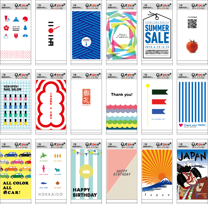 モダンなデザイン性の高いタイプ、油性ペンでひと言書き入れられるタイプ、外国人に日本らしさを分かりやすくPRできる和風図柄タイプ、全国の各県代表銘柄の47都道府県タイプなど、デザインのひな形は豊富に用意されている。