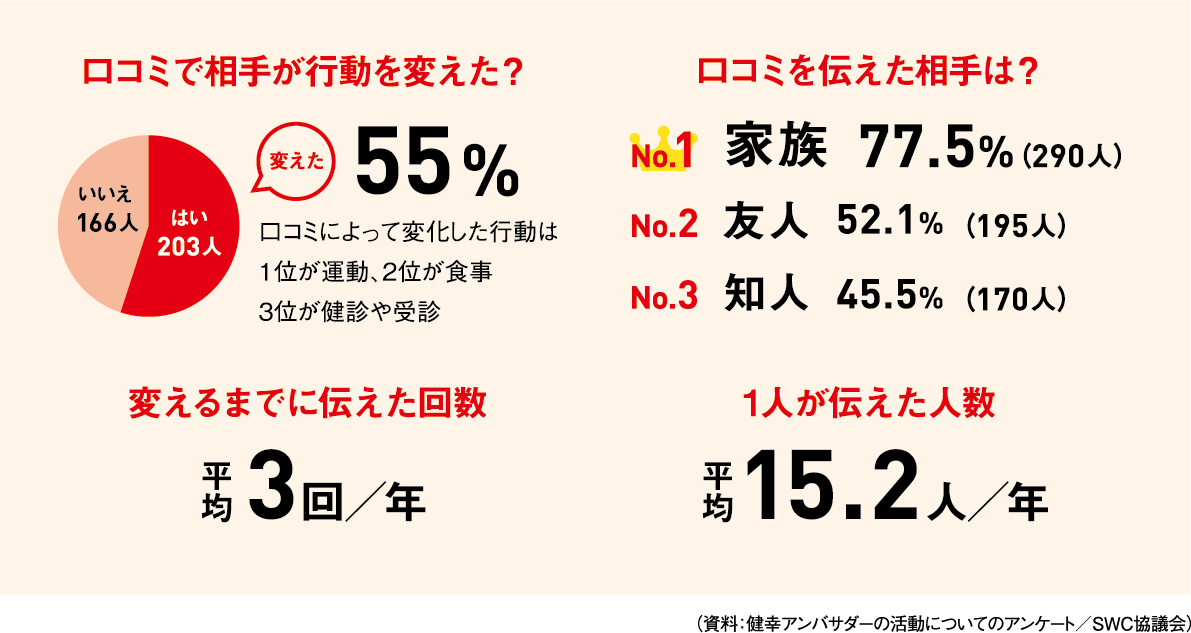 また、地域住民による口コミ活動は、スマートウエルネスコミュニティ(SWC)協議会の、平成28年度厚生労働省地域におけるインセンティブ情報ネットワークモデル構築事業「健幸アンバサダー」として仕組み化された。産官学から成るSWC協議会では、国民が自律的に健康づくりを開始・継続したくなる新たなシステムや制度の開発に取り組んでいる。健幸アンバサダーは、規定の講座を受講した上で、健康に関する知識を広める「健康の伝道師」で、令和元(2019)年10月時点で1万8,000人を超えるアンバサダーが養成されている。アンバサダーの働きかけで55%の人が行動を変えたという調査結果※も出ており、社会への貢献度も高い。