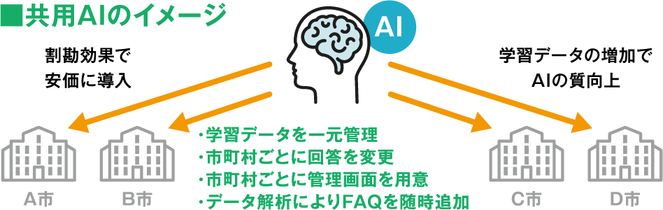 各自治体の管理画面でログ分析結果が確認可能。更に全導入自治体の学習データは一括で管理・分析され、FAQアップデートという形で各自治体に還元される。