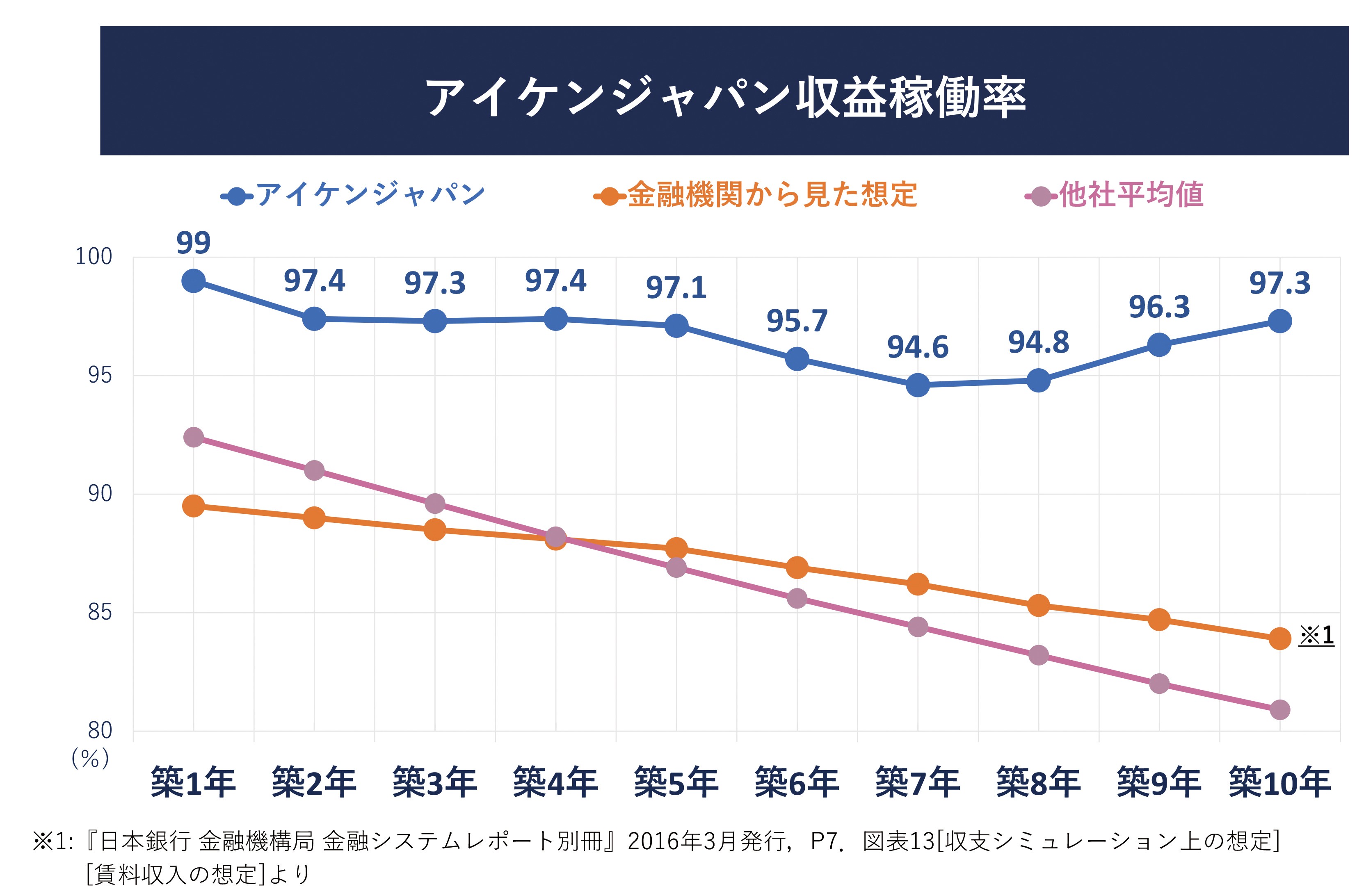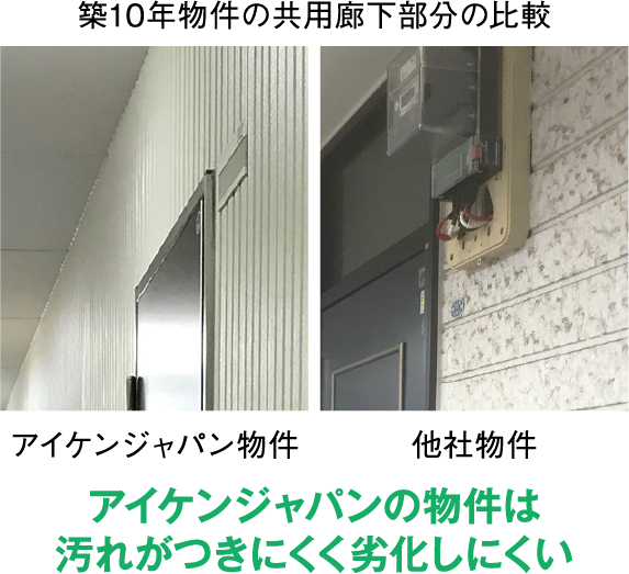 一般的には10年で2割ダウンと言われている家賃。アイケンジャパンは物件力があるからこそ、家賃を下げなくても入居者は集まる。
