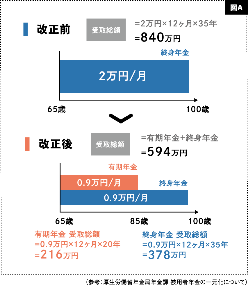 つまり、月額が減額したうえ、受け取れる期間も短くなったわけですね。特に、全額終身が半分有期になったことが大きいと言えます。「人生100年時代」と言われる中、100歳まで生きた場合、全額終身だった旧制度と比べて受け取る総額がどれほど違うのかを、標準報酬月額36万円、40年加入等、一定の同様の条件で試算してみましょう(図A参照)。