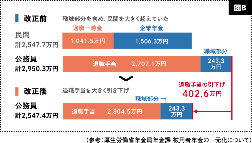 退職手当は、官民の差額是正のため、約403万円の減額が決定されました。100歳まで生きた場合に、年金給付で246万円、退職手当で約403万円の減額となり、合わせると650万円近くもの減額となるわけです(図B参照)。