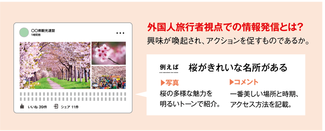 例えば、写真で地域の魅力を訴求したいのであれば、「アニメのワンシーンのようだ」と思わせるような風景をアップし、補完するコメントをつければ注目度も高まる。また、現地に足を運びやすい情報も必要だ。地域のキラーコンテンツが「桜」であれば「一番美しい場所と時期」をアップすると旅行者は的を絞りやすくなり、「現地までのアクセス方法」があれば旅ナカの安心感に繋がる。情報を提供するタイミングも重要で、夏のバカンスやイースター、タイのソンクラーン(旧正月)休暇など、国によって旅行に行きやすい時期にも違いがある。こうした情報は現地ネイティブでないと分からないことも多いため、できるだけ外国人のアドバイスを取り入れるのが賢明だ。