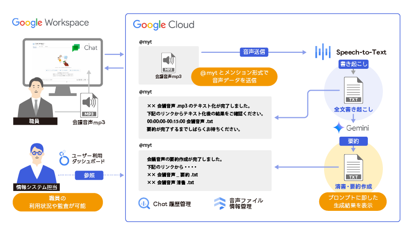 さらに、テキストと音声を同時に扱うことのできるマルチモーダル機能を活かし、テキスト化されたデータと元の音声を生成AIに再度送信して要約をつくる手順を踏むと、さらなる精度向上を期待できる。