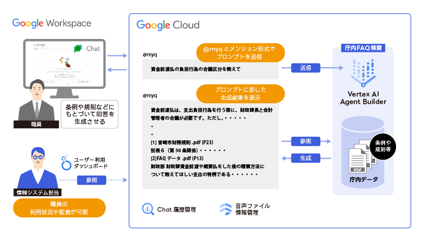 ソフトバンクでは、同サービスを「Google Workspace 」が提供する「Google Chat 」から利用できる「Vertex AI ChatUIプラン 」を開発しており、本ソリューションを同市に提供した。このソリューションを基盤に宮崎市版生成AI活用モデルを構築することを決定し、100名規模の職員が参加して実証実験がスタートした。