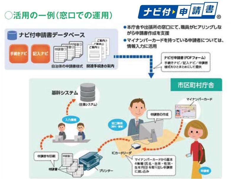 ナビゲーションに従って入力するだけなので、窓口職員でも市民でも、誰でも簡単に対応できる。住所や氏名は一度入力すると全ての申請書に反映され、記入漏れやミスを防ぐチェック機能も備わっている。市民がマイナンバーカードを持っていれば、カードから基本情報を流し込め、さらに時間短縮につながるのだ。