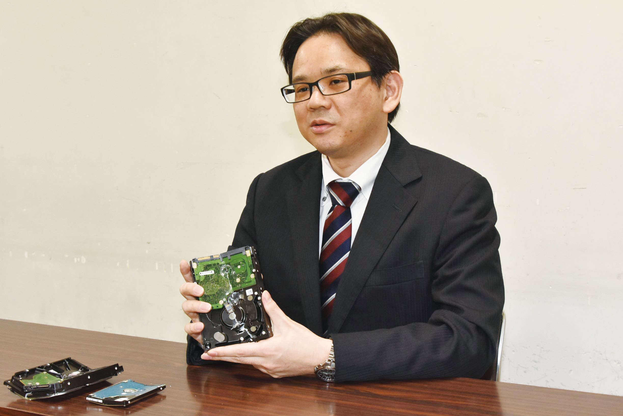 処分済みのHDDを手にインタビューに答える鈴木さん。