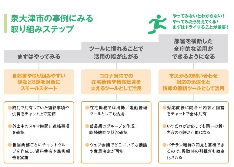 今回の経験をもとに、非常時への対応力を強化した泉大津市。政狩さんは一連の流れを振り返った後で、こう締めくくった。「職員間のコミュニケーションは、業務改革でも着手しやすい部分。まずはやってみようというスタンスでLoGoチャットのようなツールを取り入れてみれば、そこから新しい着想を得ることもあります。現場のマインドを変えていくことから始めていきましょう」。