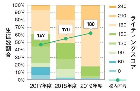 「GTEC」ライティングスコアの校内平均は2年間で30ポイント以上向上した。
